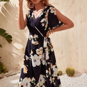 Ditsy Floral Shirred Ruffle Hem A-line Dress