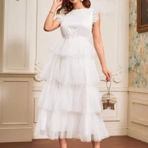 Ruffle Armhole Layered Hem Dobby Mesh Dress Without Belt