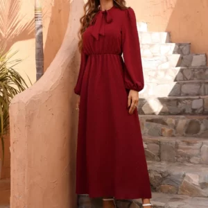 Swiss Dot Tie Neck Lantern Sleeve Dress Without Belt